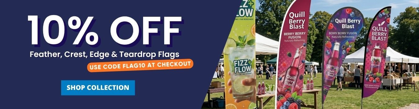 Our custom printed feather flags are available in five sizes from 2.1m to 4.9m, making them ideal for outdoor events, retail promotions, roadside a...